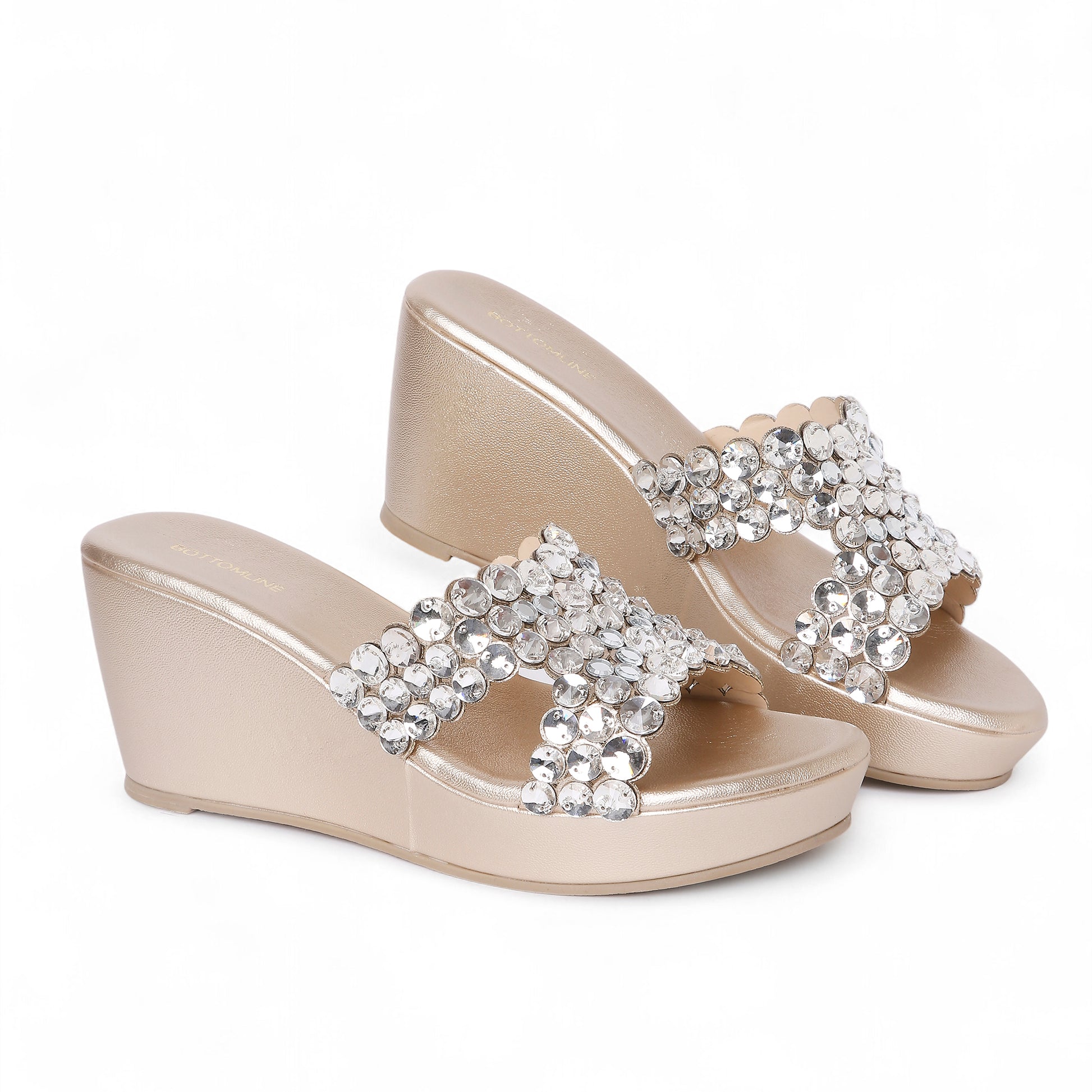 The 3-inch wedge heel offers an elegant lift while maintaining comfort, making Celestia the perfect choice for weddings, festive occasions, or evening celebrations. With its cushioned insole and handcrafted vegan leather base, this pair blends sparkle with stability.