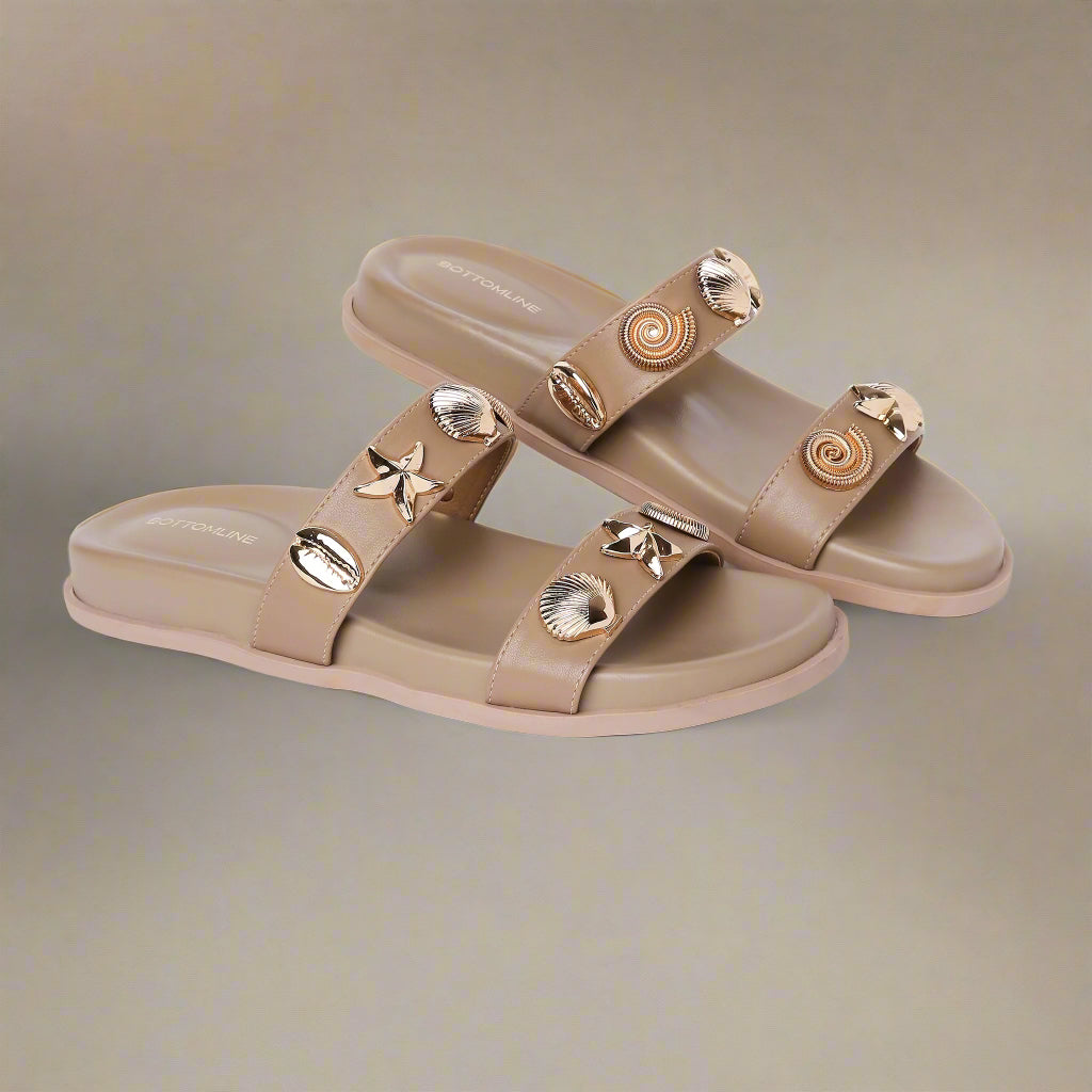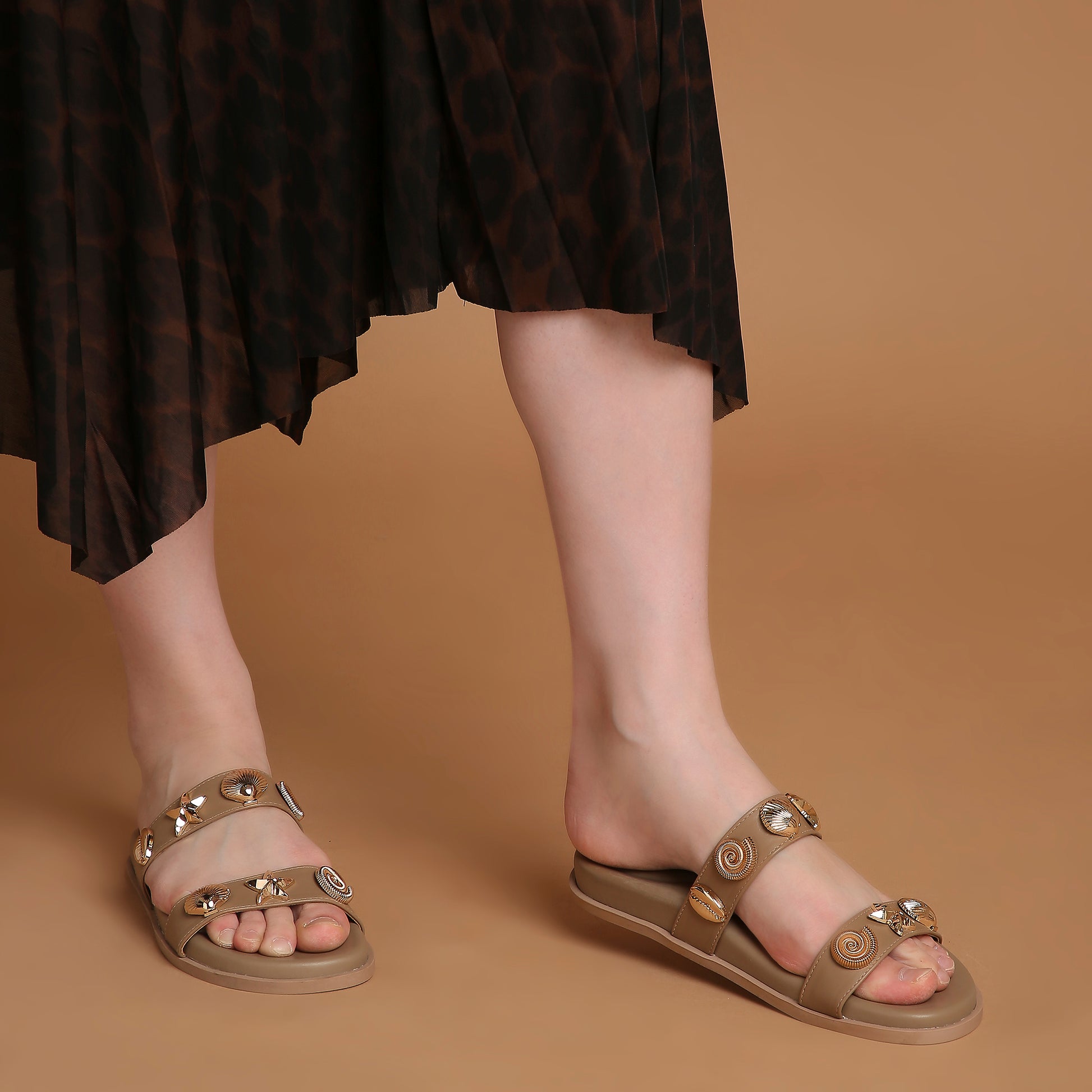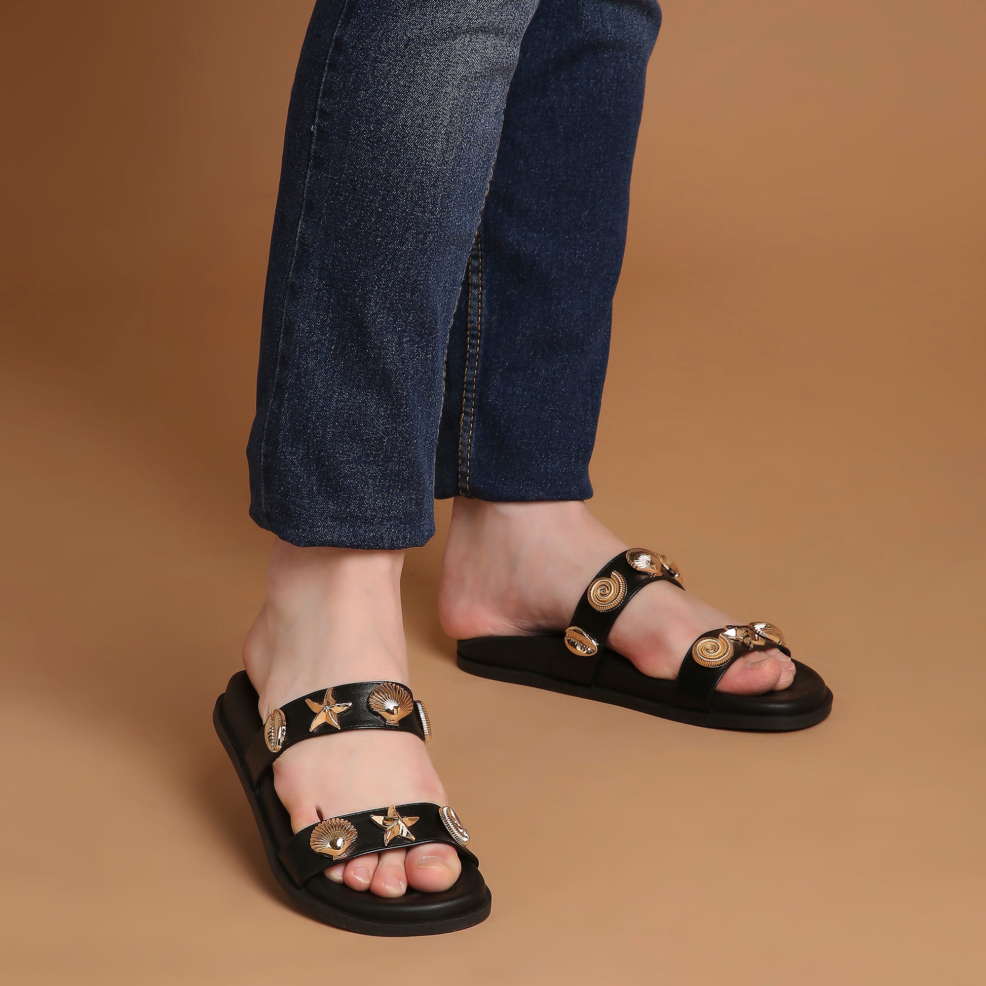 Available in Black and Coffee, this flat sandal features double straps adorned with gold sea-inspired embellishments— from shells to swirls and star motifs. Its playful yet sophisticated look makes Kaia your go-to choice for everyday wear, festive styling, or even travel when comfort is key.