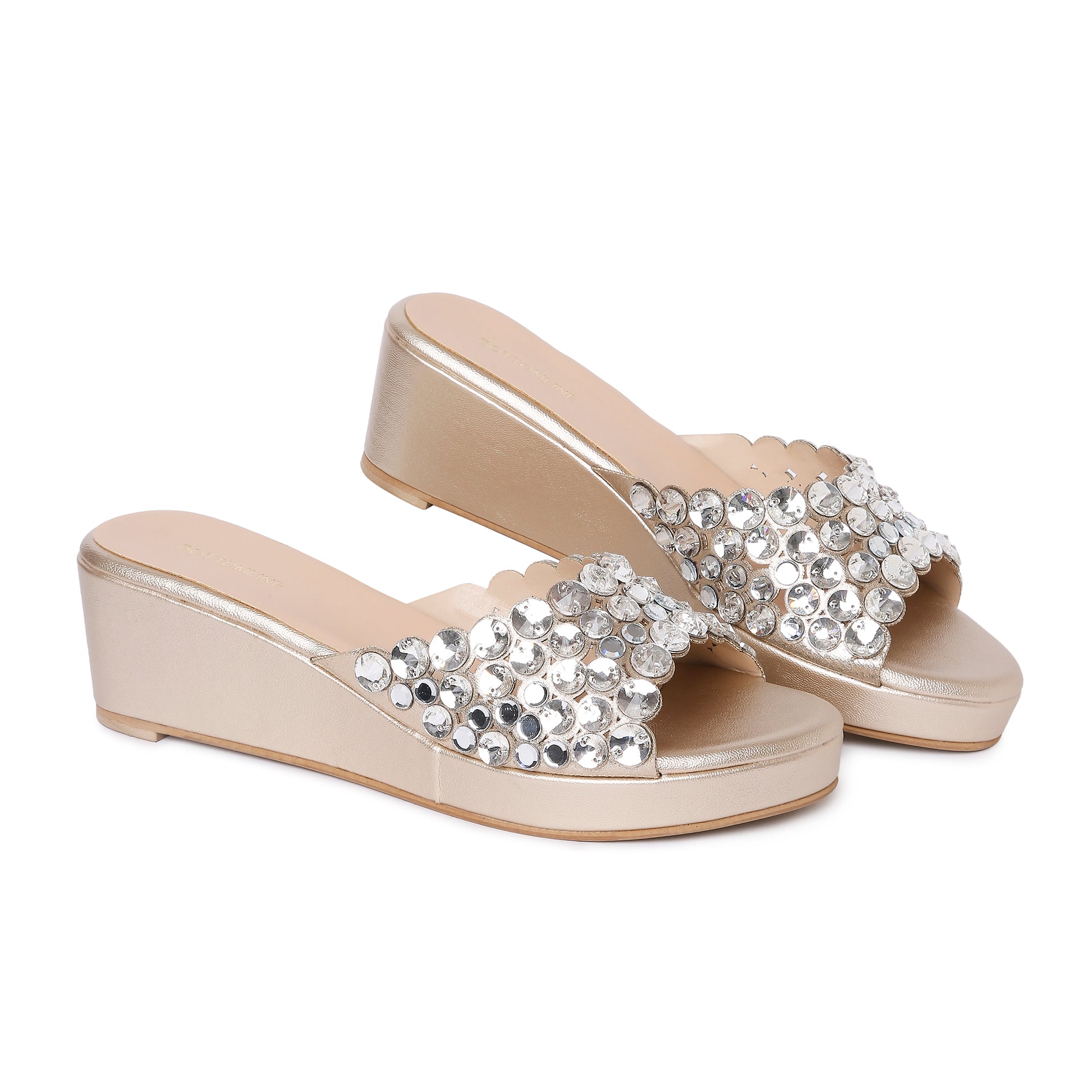 Turn heads with Seraphina, our handcrafted formal wedge designed to dazzle. In a sophisticated Rose Gold shade, Seraphina is adorned with sparkling crystal embellishments across the upper, catching the light with every step.